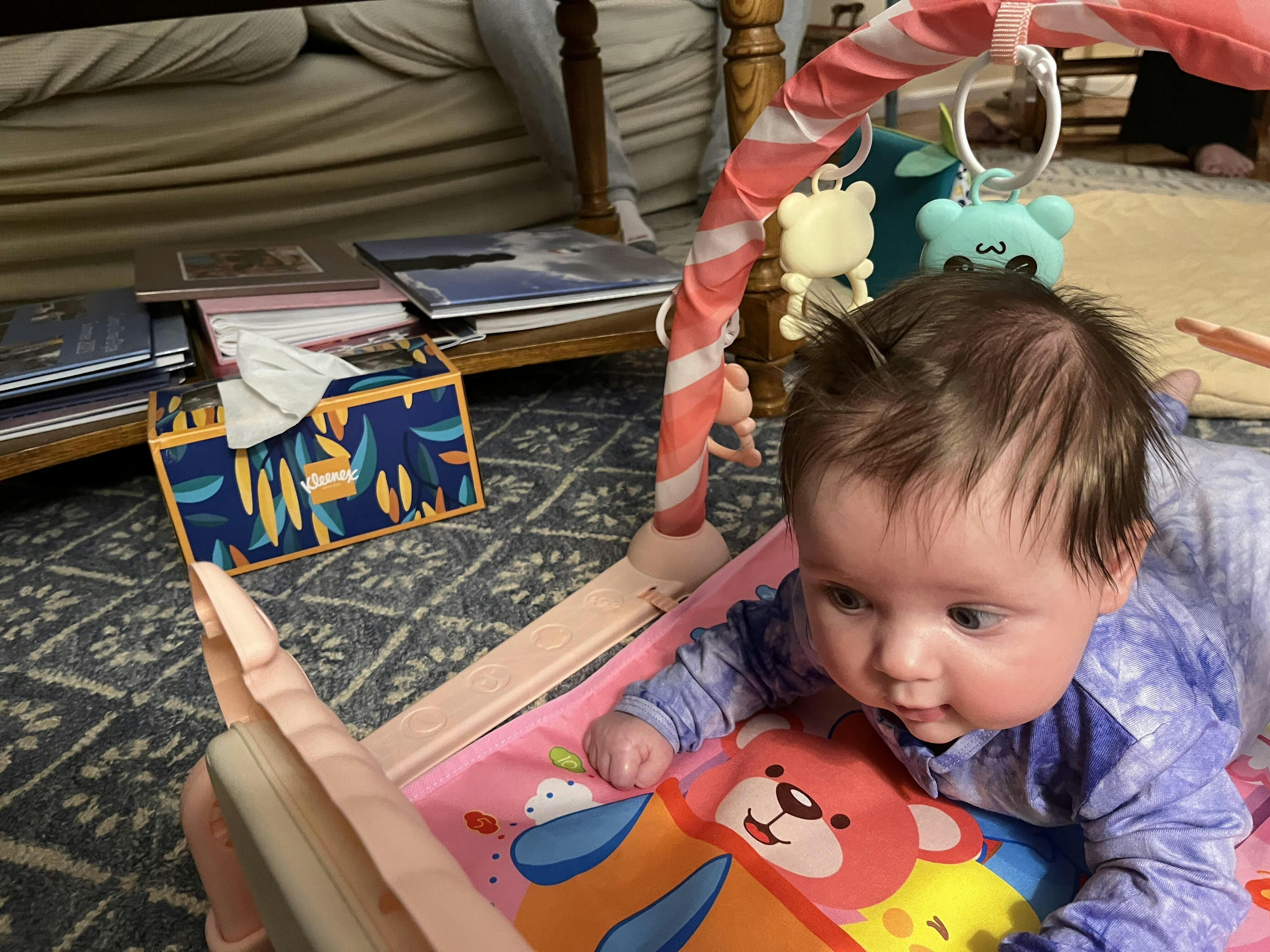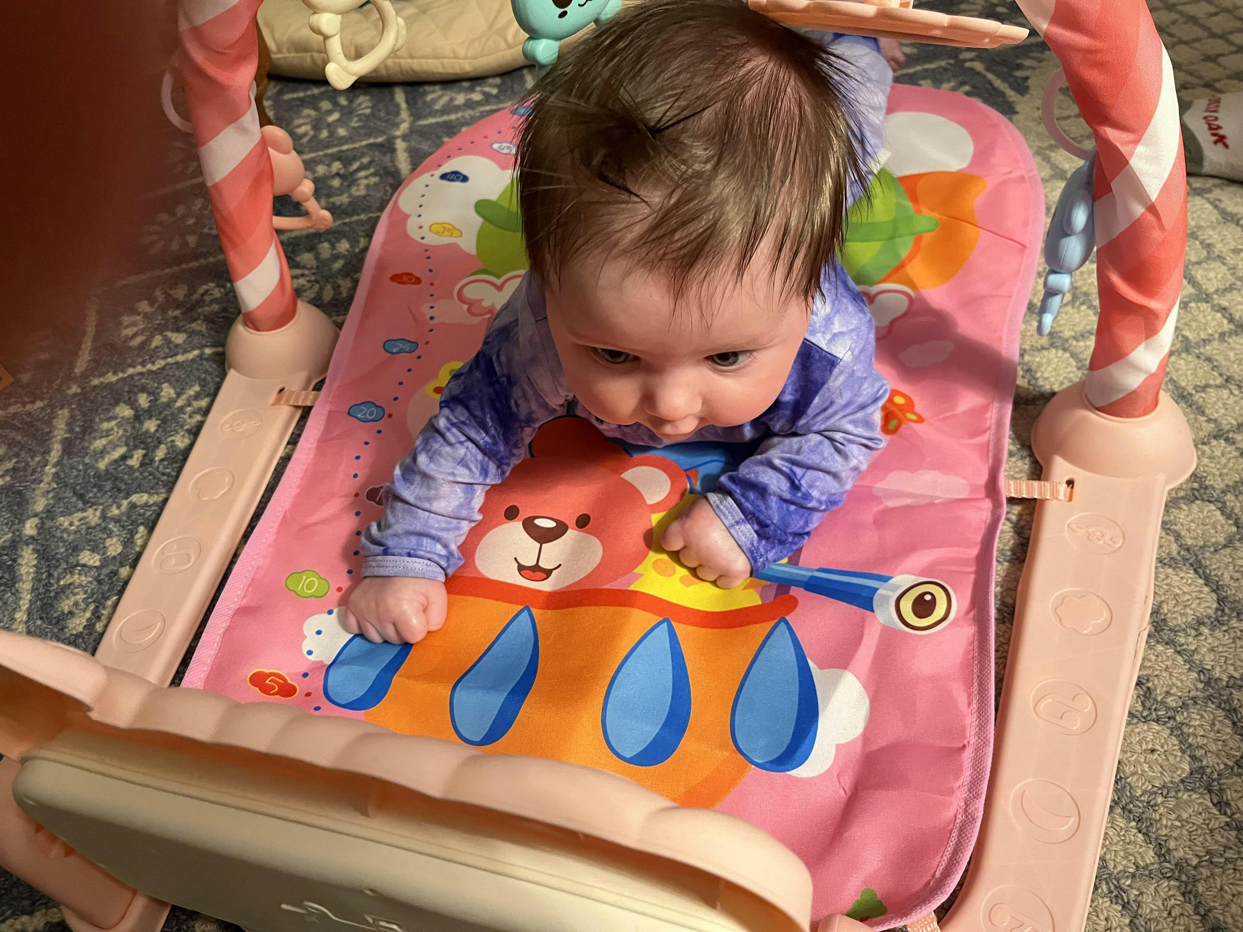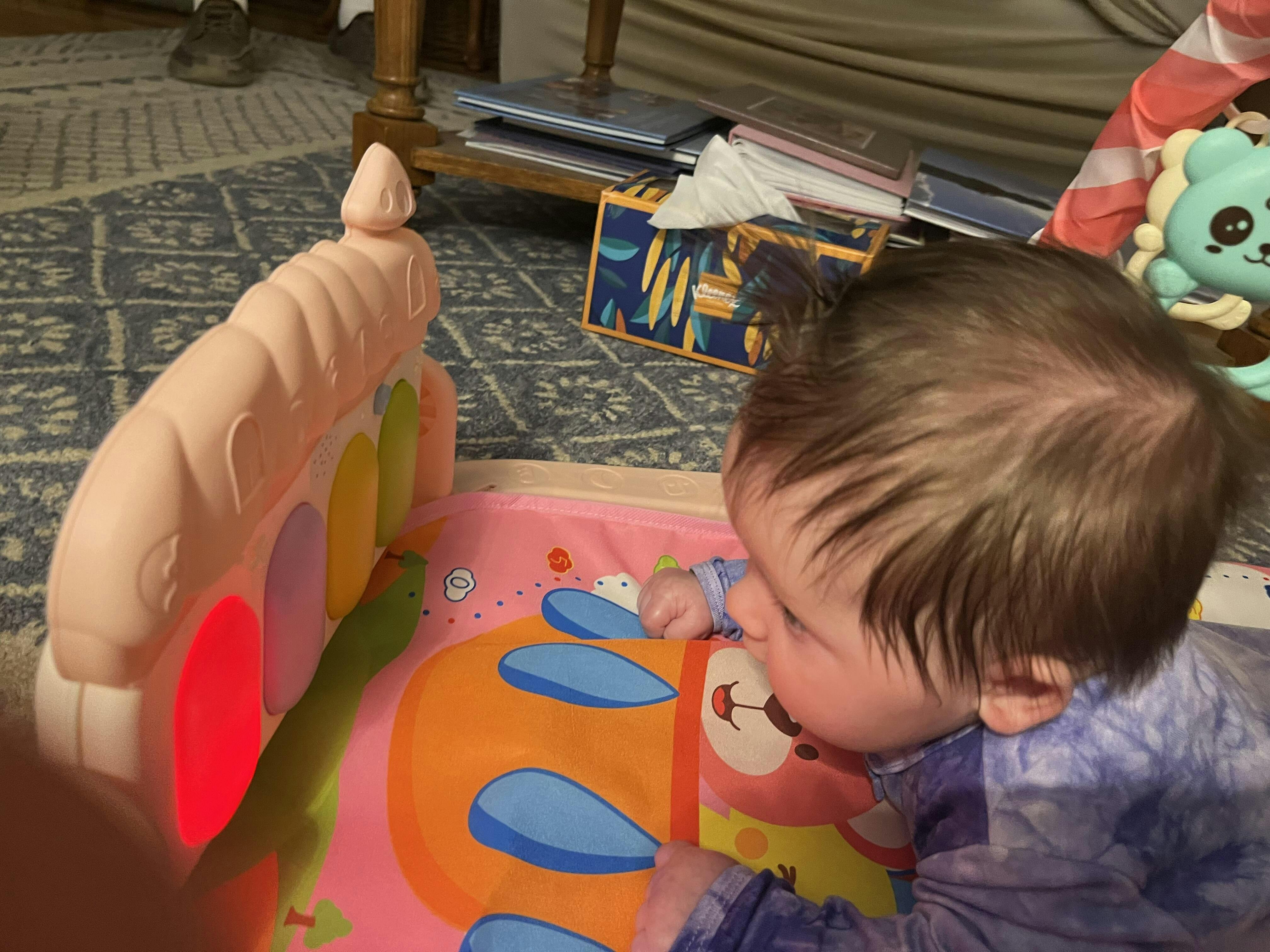 Our 3 month old granddaughter loves it. We all got a kick watching her change the tunes when she accidentally touched the keyboard n she was very engaged by the hanging toys. Encouraging her to reach, grasp n of course put them into her mouth. So engaging n lots of room to grow with her.