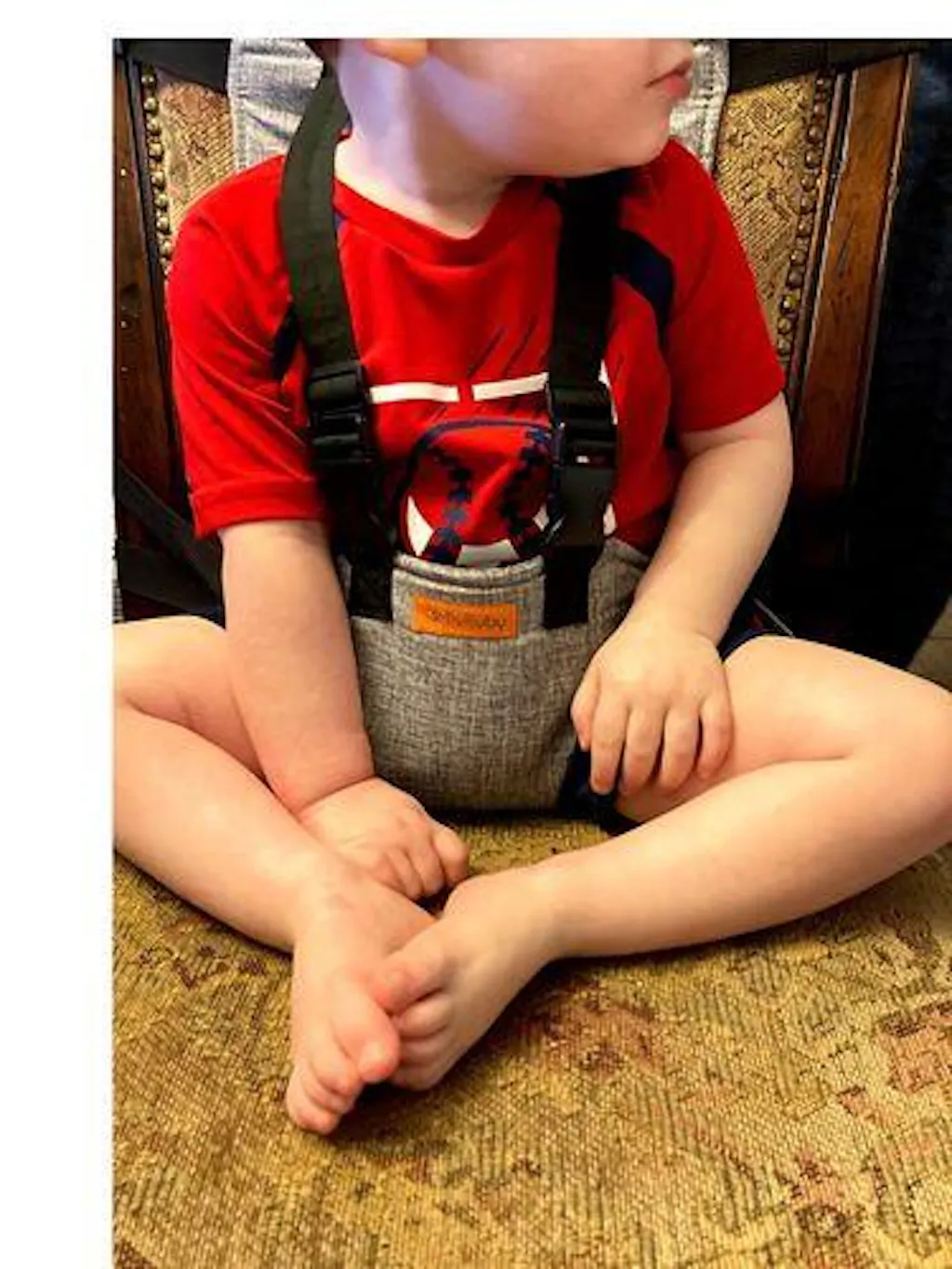 What a great product! Wonderful for travel, but we use it at home, too. Fits on pretty much any dining room or restaurant chair. Very sturdy and well-made. Fabric wipes up easily after spills. It’s machine washable, too. Adjustable to suit small babies to older toddlers. All parents should have one!