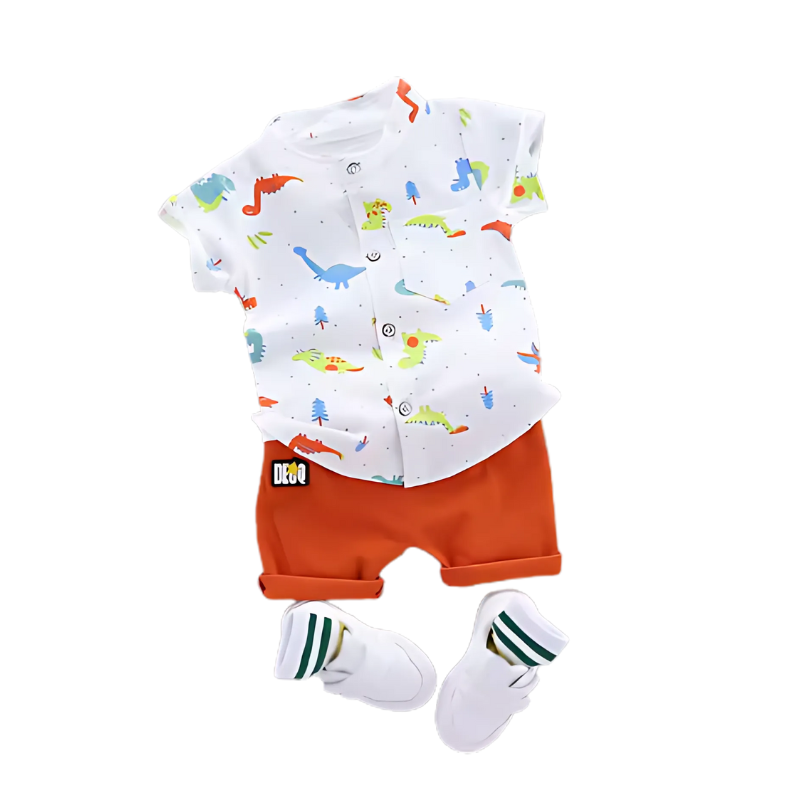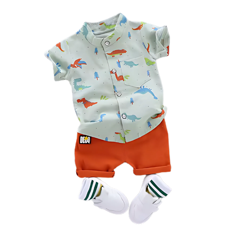 Let your little explorer stay cool, comfy, and irresistibly cute in the Dino Summer Set, a soft and breathable two-piece outfit featuring a playful cartoon dinosaur print, a stylish stand-collar short-sleeve shirt, and matching shorts—perfect for sunny adventures, cozy playdates, and capturing unforgettable moments.